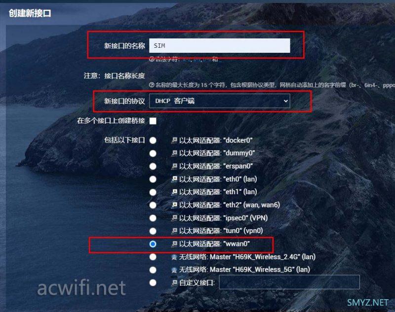 名称随便填,协议选择DHCP客户端,把接口”wwan0“勾选上。