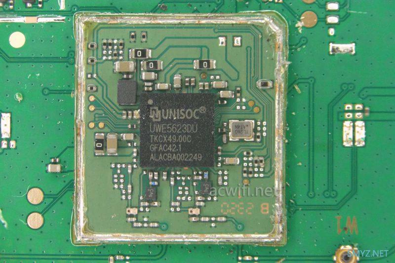 里面是一颗我第一次看见的芯片,可能拆手机的人经常见吧,型号是紫光展锐的UWE5623DU(集成了Wi-Fi 和蓝牙)。它支持802.11ac,2.4G和5G均是2x2mimo,2.4G也支持256-QAM,所以2.4G最高速率是400Mbps,5G最高速率是866Mbps。它做AP角色的时候,不能双频并发,所以系统里选择是用2.4G还是用5G,就像手机开热点一样。(现在有没有手机开热点能双频并发的?)