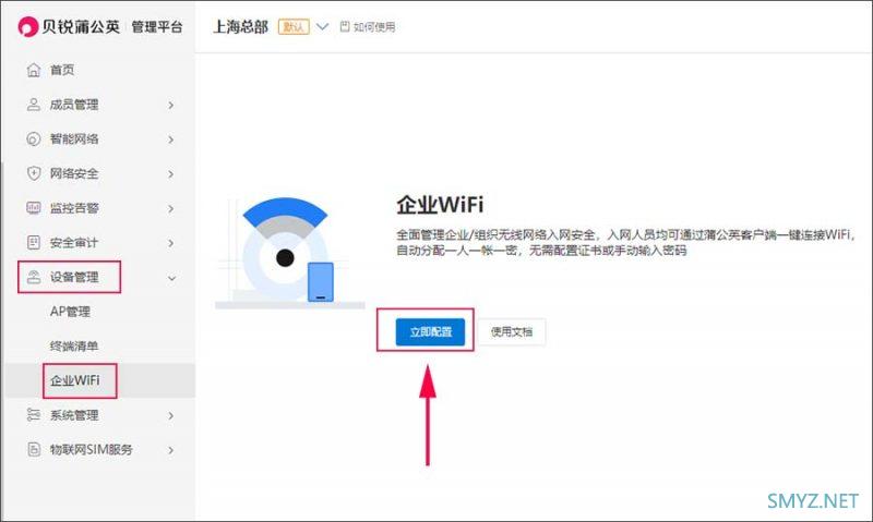 (1)点击点击【蒲公英管理平台】->【设备管理】->【企业WiFi】->【立即配置】;