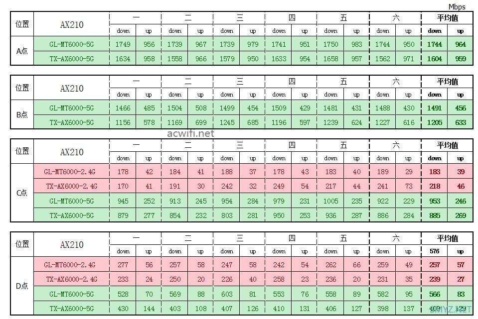 在A、B、C、D四个位置里,5G平均速度都是GL.iNet MT6000比较快。