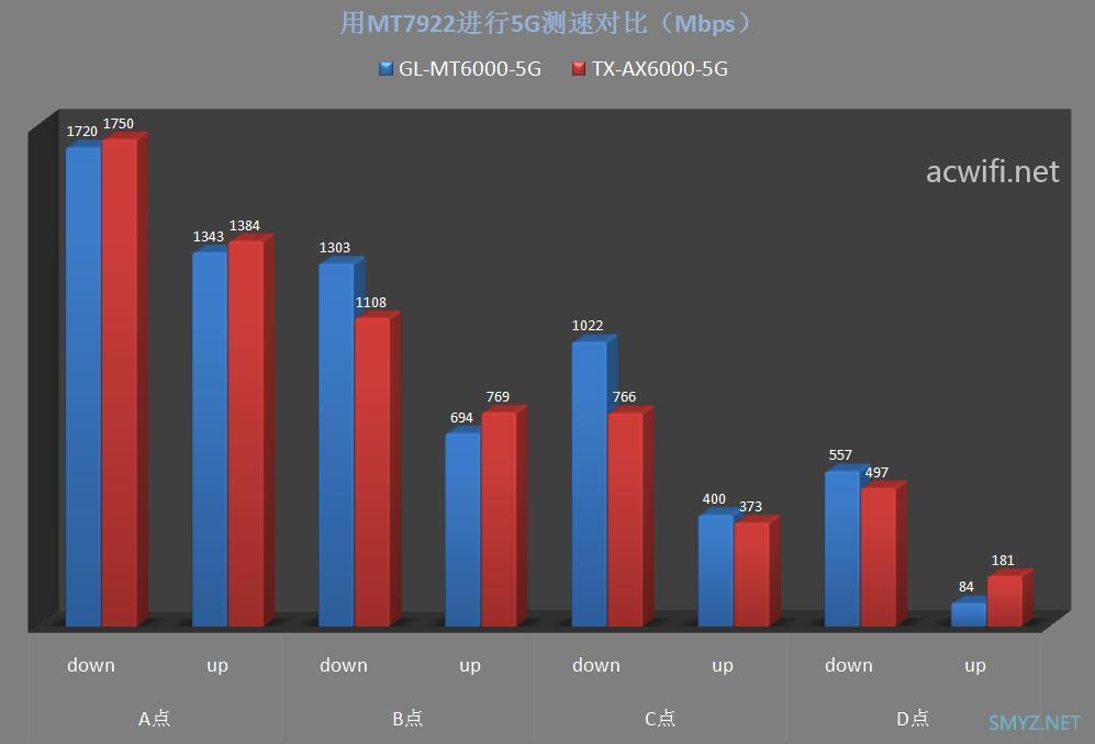 A点位置的5G均速度是华硕天选路由器快些,其余三个位置均是GL.iNet MT6000快。