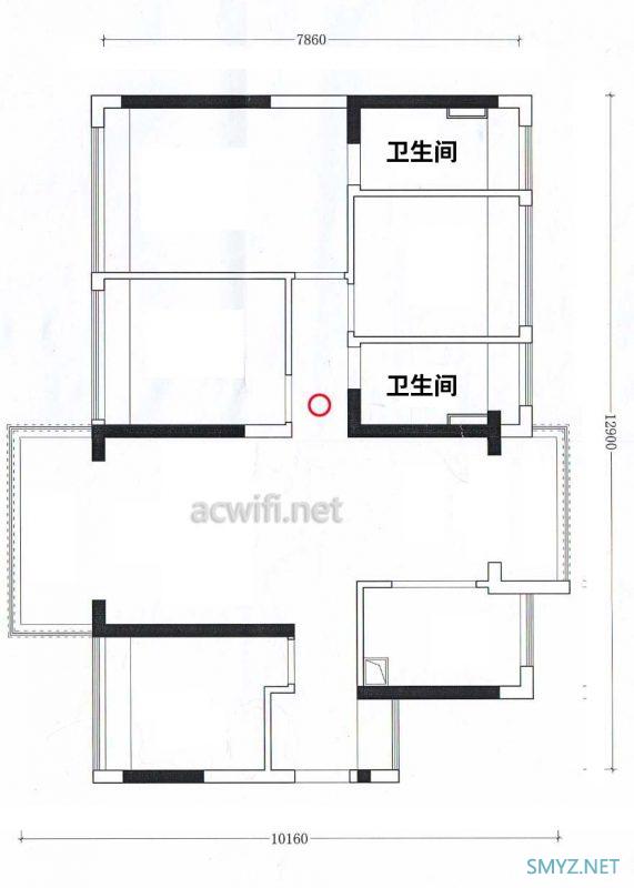 三台吸顶AP都装在同一个天花板位置,而这个位置位于房子的正中心,如下图红圈位置所示:(黑色实体墙就是水泥墙)