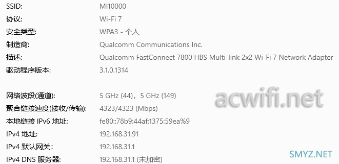两台无线路由器的5G1信道设置44,5G2信道设置149,无线网卡WCN7851连接上小米万兆路由的情况如下: