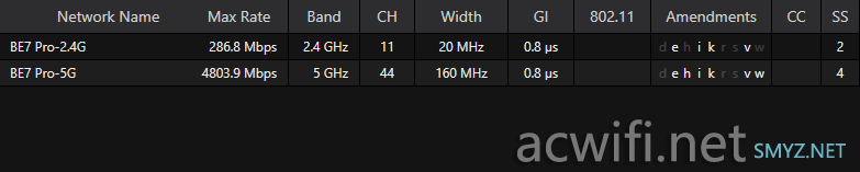 用WCN7851无线网卡连接华为BE7 Pro,就会显示两个频段同时连接上: