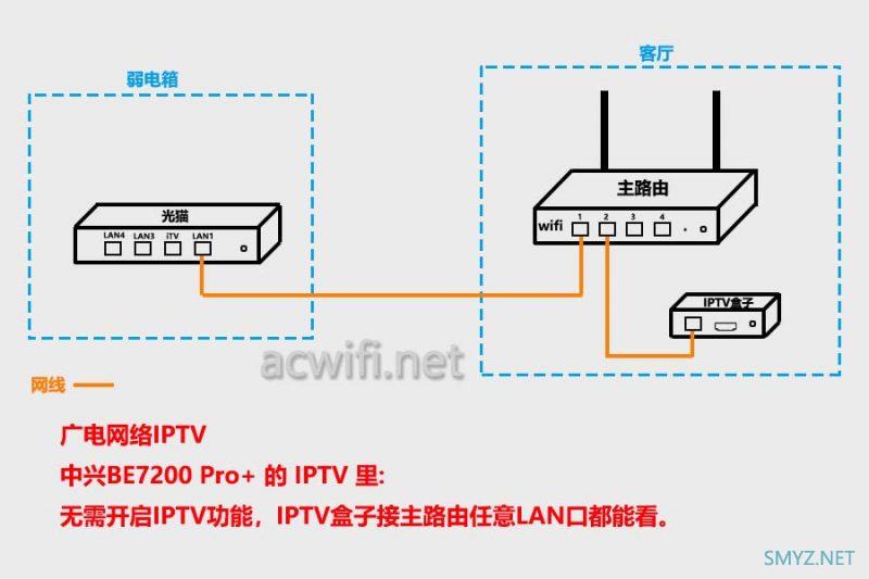 中兴BE7200 Pro+的IPTV不需要开启,随便插哪个LAN口都可以看电视,连接示意图如下:
