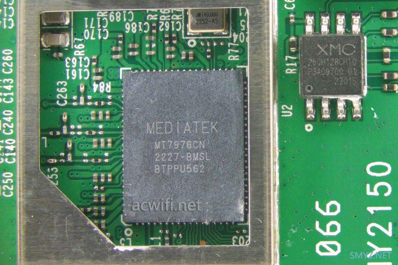 无线射频芯片是MT7976CN,2.4G支持2T2R,集成2.4G FEM,5G支持3T3R,集成5G FEM。