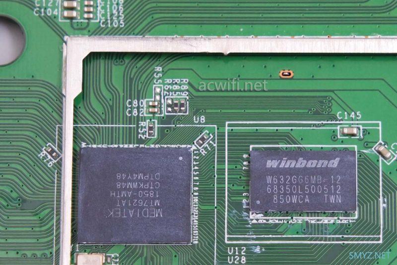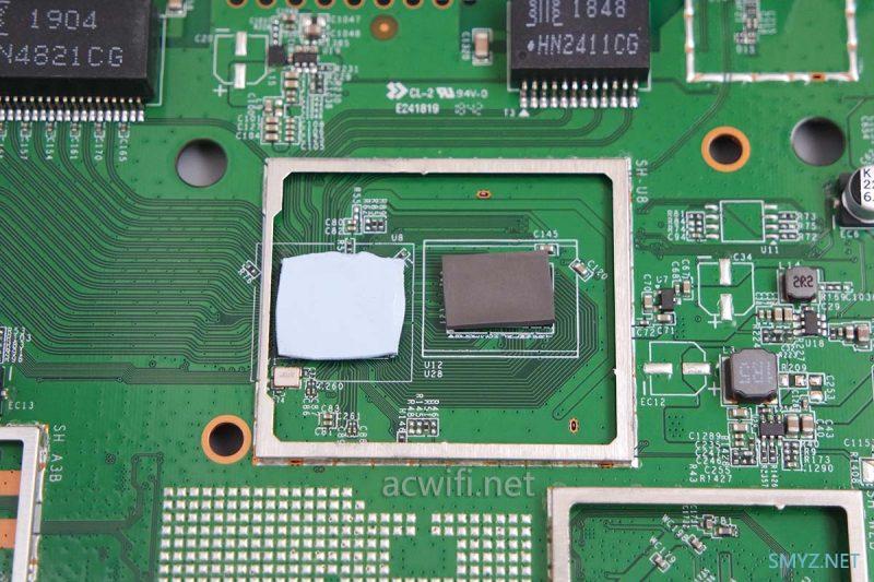 在两颗无线芯片的上方有个屏蔽罩,里面空的,这个位置应该是CPU的正下方,它的左边有一颗闪存芯片,型号是MX30LF1G18AC-TI,容量128MB。