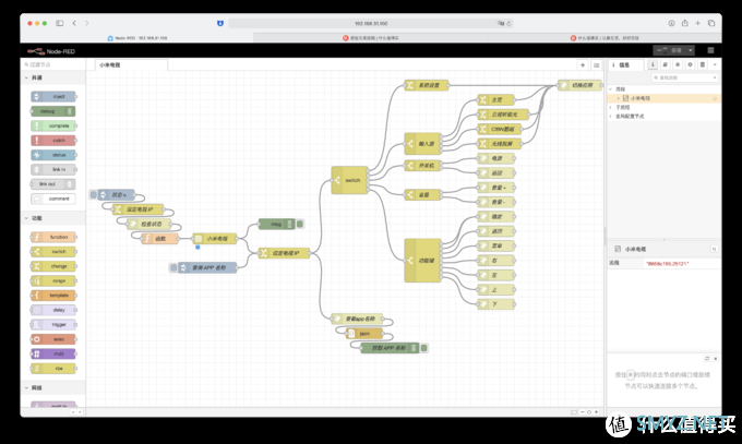 简单分析一下这个流程图,中间的“小米电视”节点为“核心”节点,也就是一个HomeKit配件,其左边的是传入状态,其右边的是根据用户通过 HomeKit APP 操作后传出的相关指令,不懂也没有关系,可以先去了解一下Node-RED,如果只是为了小米电视的话,跟着我改就行。
