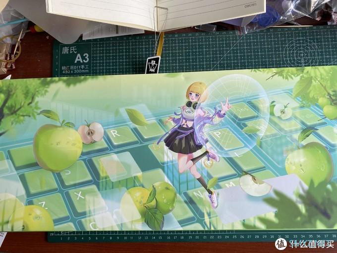 给几张特写,在几个关键键位上,键帽都是个性化定制的,有设计的可爱图案。esc键是美少女头,shift键是果实的形状,空格键则是立体绘画的小男生一枚,方向键的果实也很有特色,整个键盘都透露着青春洋溢的味道。