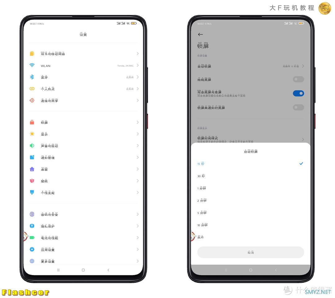 点击【设置】——选择【锁屏】——设置锁屏时间,比如,15秒等。
