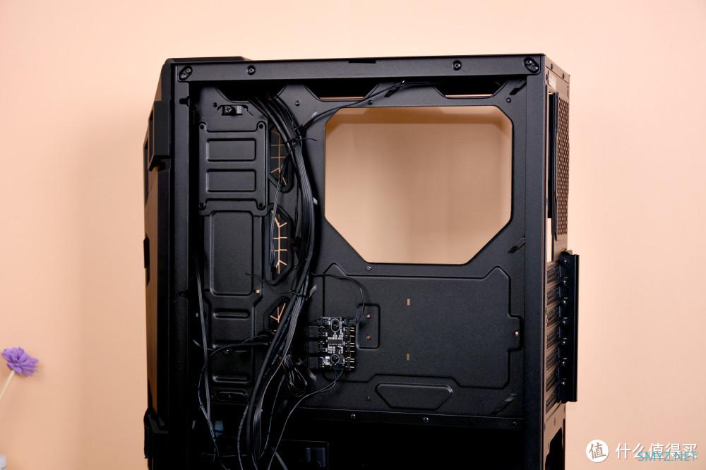 背面中部有一块PCB小板,支持5V 3针ARGB灯效同步和控制,这个PCB小板拓展出6个灯效接口,机箱的风扇占了其中三个,还剩下三个灯效接口,便于连接更多的支持ARGB灯效的设备,右侧是2.5硬盘固定位