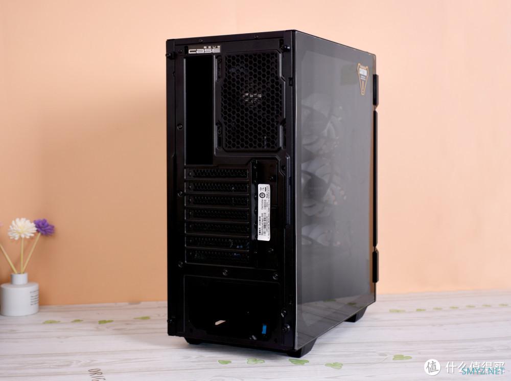机箱右侧是主板固定位,中间有五边形的背板开口,机箱后部自带一把机箱风扇,上面有TUF GAMING的LOGO