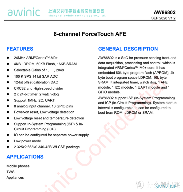 AW86802是一颗压力感应IC,支持8通道输入,内置14bit ADC,gain 2048,支持看门狗,16GPIO,20uA@10HZ&2channels。采用WLCSP 2.325mm*2.665mm的封装。