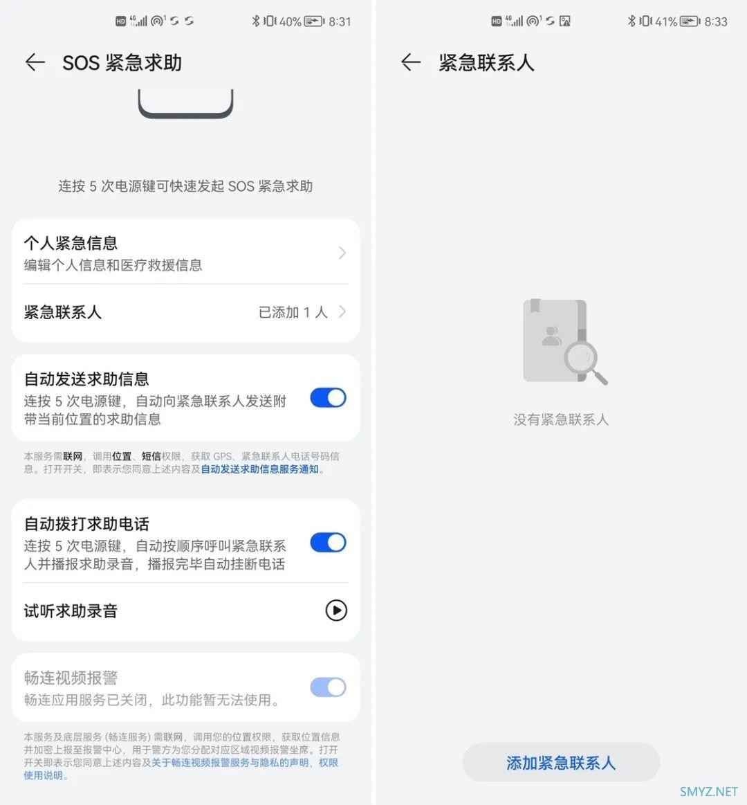 在华为手机中,无论是 HarmonyOS 还是 EMUI 11,SOS 急救功能的设置页面被放在了「设置 - 安全」的页面中,与 iOS 类似的是,HarmonyOS / EMUI 11 也不提供打开或关闭这一功能选项,同时也有动画引导。