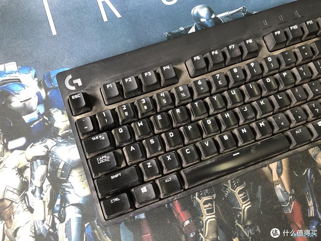可以看到这把键盘使用时间还是挺长的,外壳以及键帽之间有很多尘土,我想这也是很多玩家现实键盘的状态。