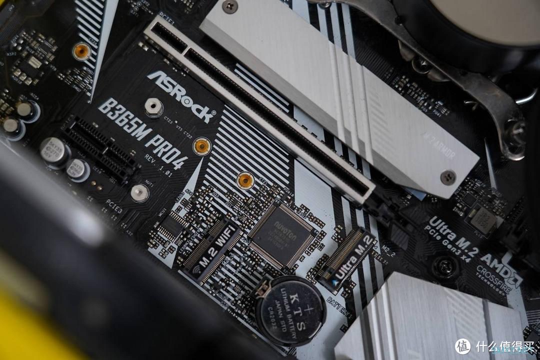 华擎的B365M PRO4主板,M-ATX规格,8相供电的设计,自带两条M.2插槽,总体也是相当够用。