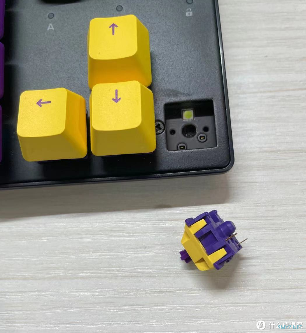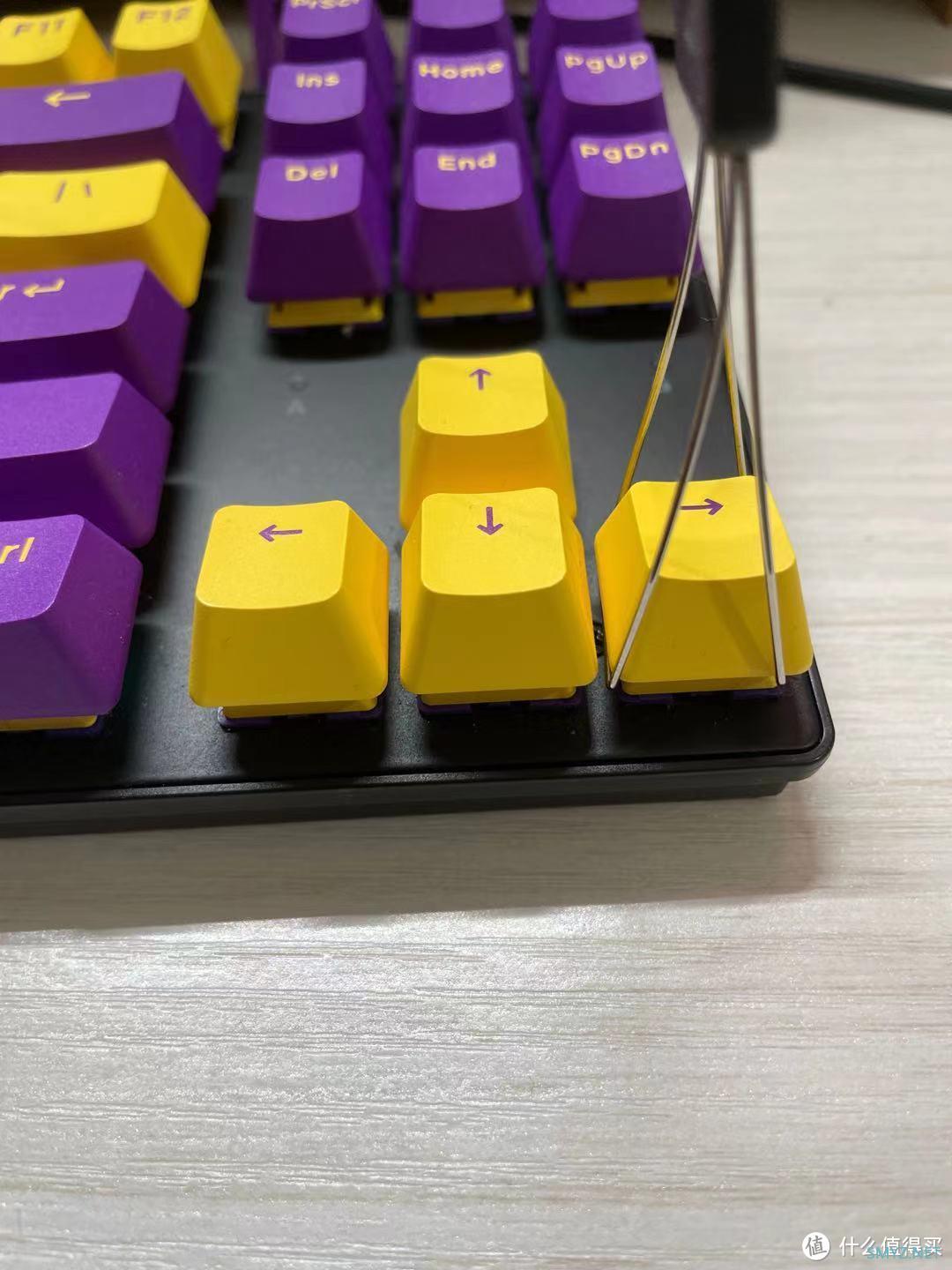 不过更换轴体后,还有一个问题,那就是灯光的颜色,会受到一点点影响,换上天空轴的键位,颜色偏蓝色,而紫金轴的键位颜色是偏白的