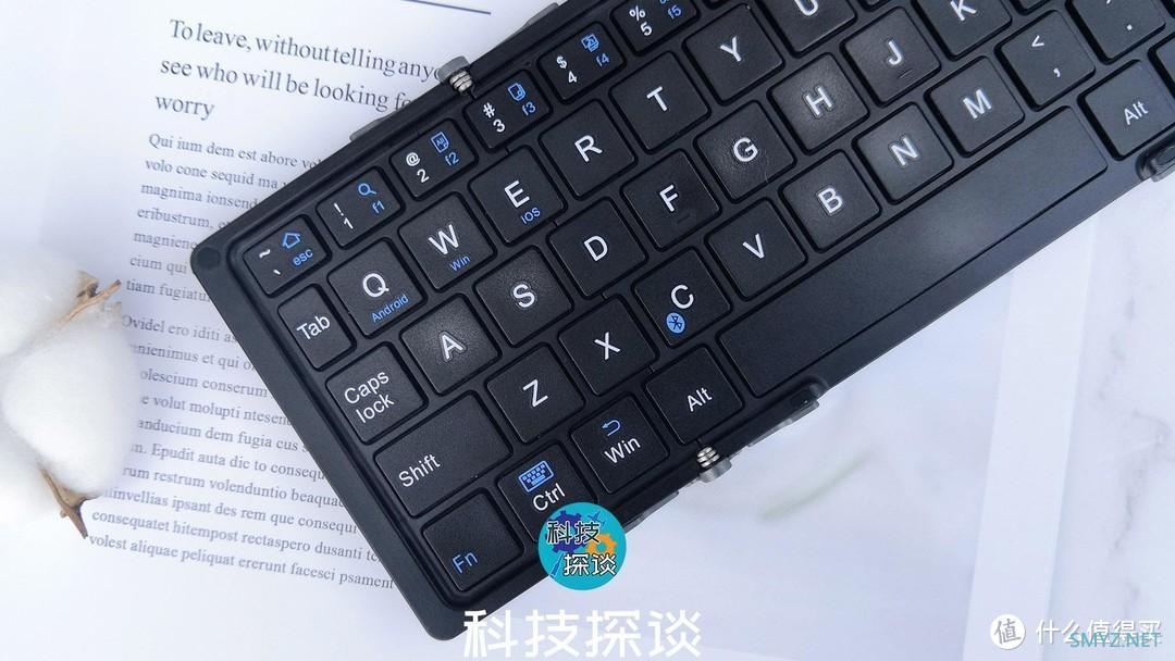 键盘上有64个按键,为了减少键盘的体积,有不少按键都具有重复功能,需要与Fn键配合使用。从“Q”、“W”和“E”键下的蓝色标识来看,这款航世三折叠键盘能用在安卓、iOS和Windows操作系统上,