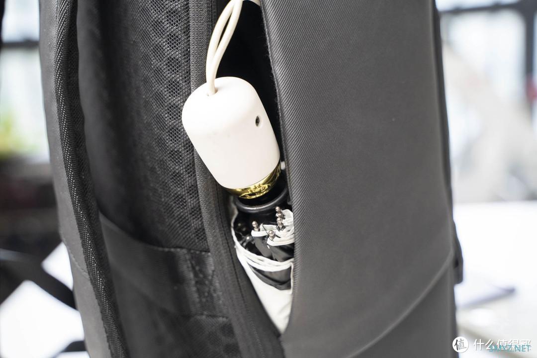 隐藏式侧袋也极具设计感,其内部是采用了防水设计,适合放水杯、雨伞等物品,不用担心影响主袋和其他副袋。而且侧袋空间非常大,里面一直延伸、可以占用主袋相当多的位置,当有侧袋需要放更多物品时、比如雨衣等,一样能放下,这个考虑挺人性化的。