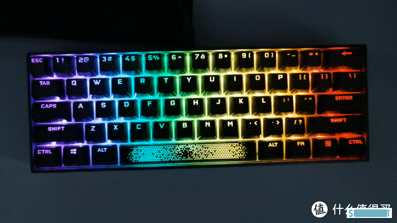 K65 RGB MINI采用经典的60%类Poker配列,用惯了104键全键盘的小伙伴第一次看到它多少有点感觉别扭,感觉缺少了点什么,毕竟功能键区、控制键区和数字键区都被取消了。