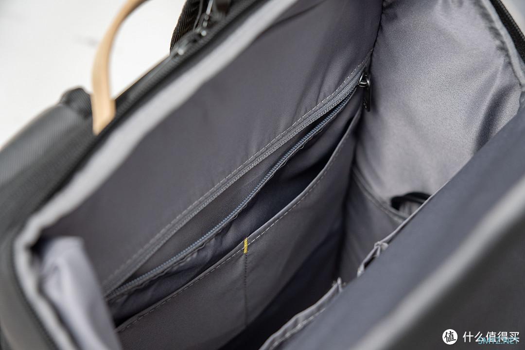 |下面再来总结一下,这款背包的口袋均采用了隐藏式设计,这也使得整体外观简约大气的同时,储物空间也大大增加,创新性的磁吸式设计,拿取物品时非常的方便,单手即可拿取,并且还设计了独立的电脑仓,可以有效的保护电脑,背包细节处采用了真皮设计,整体质感更好,背包外面整体采用了防水材质,能避免进水以及摩擦等问题,以及透气设计等等,给我一个很不错的体验。