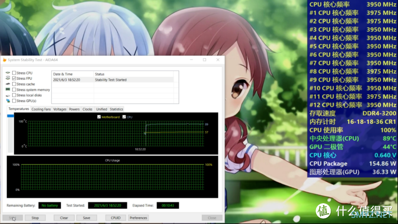 惯例的ADIA64稳定性测试,烤机10分钟,cpu温度稳定89度,散热器的表现也还行,能轻松压得住这颗3900X。