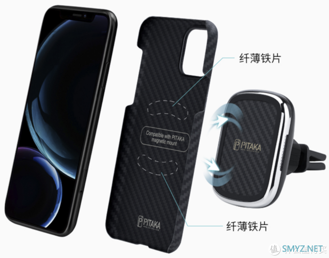 而pitaka的保护壳完美解决了这个问题。它通过将内藏的铁片——对,在0.85mm的厚度中藏了铁片——进行镂空处理,漏出了无线充电线圈的位置,让它既能被磁吸,也能正常无线充电。
