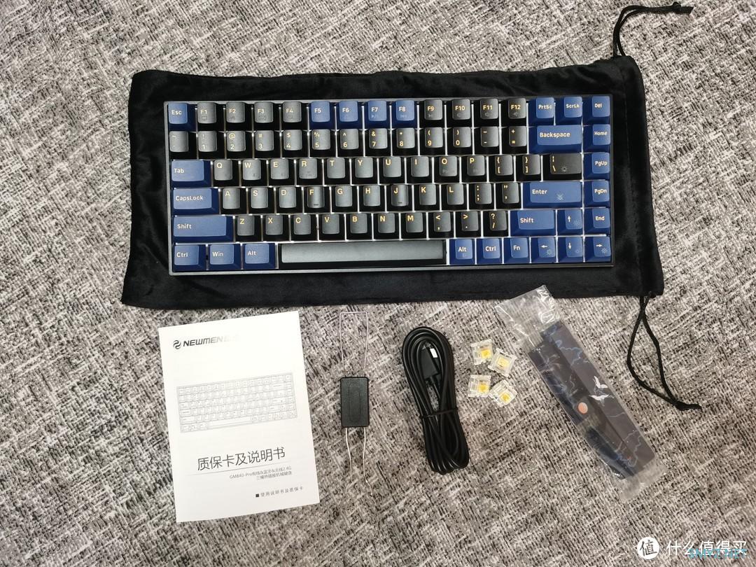 新贵 GM840Pro 鹤舞月明版G黄Pro轴三模机械键盘全家福:键盘×1、键盘保护套×1、Type-C数据线×1、质保卡及说明书×1、拔键器拔轴器二合一×1、备用的G黄Pro轴×4、增补键帽×4、无线2.4G接收器(键盘底部)×1。