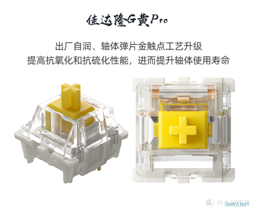 佳达隆G黄Pro轴:出厂轴体自润丝滑无弹簧音,同时对模具做了优化,轴芯更佳的稳定,轴体弹片金触点工艺升级,提升了抗氧化性能,从而进一步的提升了轴体使用寿命。