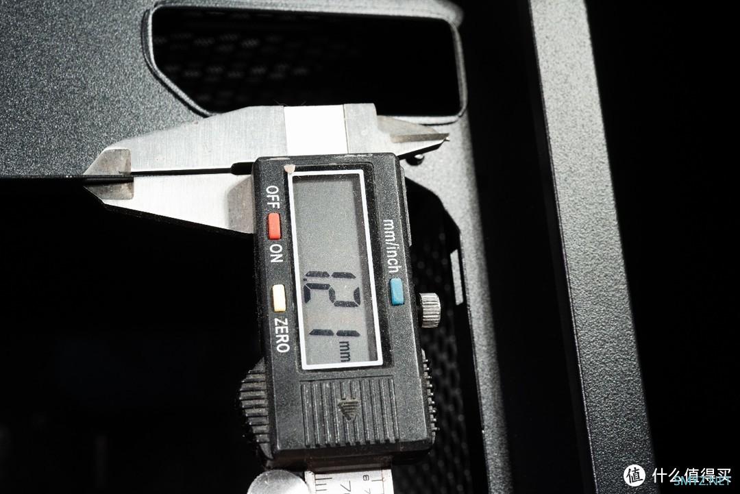 对主板到侧面玻璃盖板的距离进行估算,最大支持的散热器高度约195mm,主板背面到机箱背板的距离约20mm