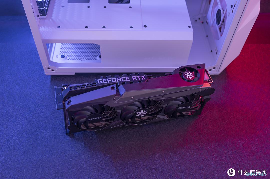 映众RTX3090冰龙超级版显卡所搭配的四风扇冰龙散热器几乎覆盖住了整个PCB正面。炫酷的散热器造型,令这款新卡皇看上去霸气十足,当然了长度也达到了305mm。