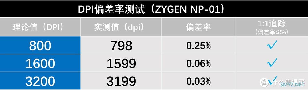 【DPI实测】提出1:1真实追踪的是赛睿,但近两年我们测试的产品来看,它在DPI这块做得并不最出色,结合前面几个不足0.5%的,SENSEI TEN的3.43%的偏差就因对比带来了伤害,有轻微的加速,但还在1:1范围之内。