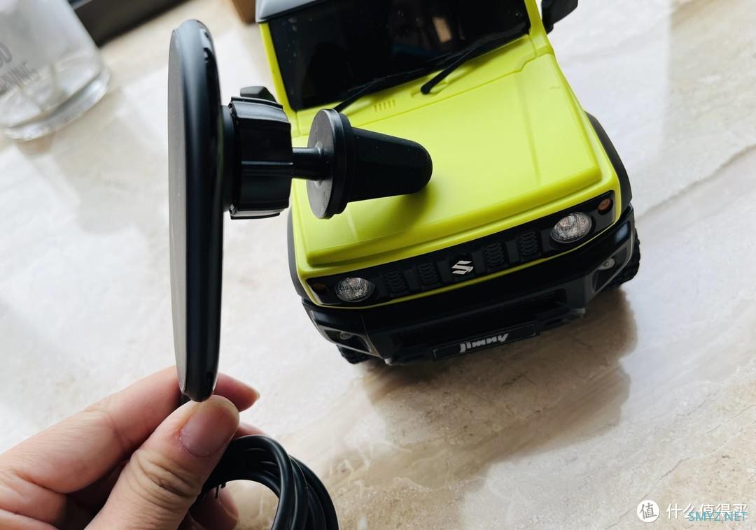 支持360°调节,不管横置还是竖置都可以正常使用。同时对于支架的角度也可以上下调节,配合我们的视线,达到最好的显示效果。充电功率方面,Magsafe技术加持下,可以做到10W的无线快充,保证手机正常使用不掉电,一路导航到目的地,电量还是满满的。