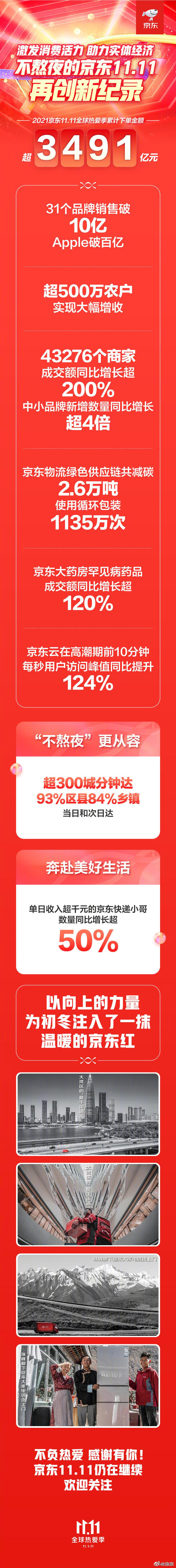 今年的双十一大促已正式落下帷幕,京东官方于凌晨宣布,不熬夜的京东11.11累计下单金额超3491亿,再创新纪录!其中,31个品牌销售破10亿,Apple破百亿;超500万农户实现增收;43276个商家成交额同比增长超200%,中小品牌新增数量同比增长超4倍;京东物流绿色供应链共减碳2.6万吨,使用循环包装1135万次。值得一提的是,从预售到开门红,广大消费者已经习惯了享受晚8点带来的便利,由于不再需要等到午夜,不会影响第二天上班,消费者可以在茶余饭后从容地打开手机,享受高品质商品、服务与购物体验。 京东11.11不仅给消费者带来商品最多、价格最优、服务最好的购物体验,更在推动消费提质扩容,为更多产业链伙伴,尤其为广大中小商家、农户持续创造价值。