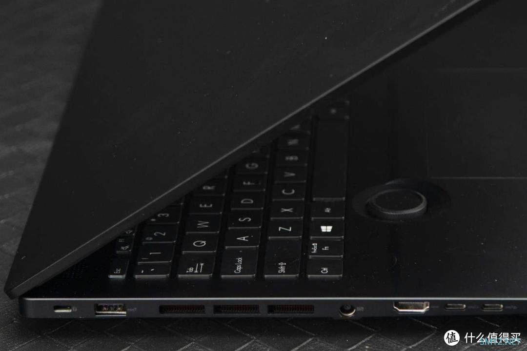 C面是华硕ProArt 创16最有辨识度的一面,也是有最多细节值得一说的部分。虽然加入了ASUS Dial物理创意旋钮,但华硕ProArt 创16的键盘并没有因之而变得局促,大尺寸键帽和全尺寸间距的设计让操作相邻键位时也不会显得那么拥挤。1.4mm的长键程再加上下凹弧面的键帽使得敲击键盘的手感也相当不错。当然,华硕ProArt 创16的键盘也是支持背光的,并且支持三级调节,在夜间场景它也会给到我们一些助力。