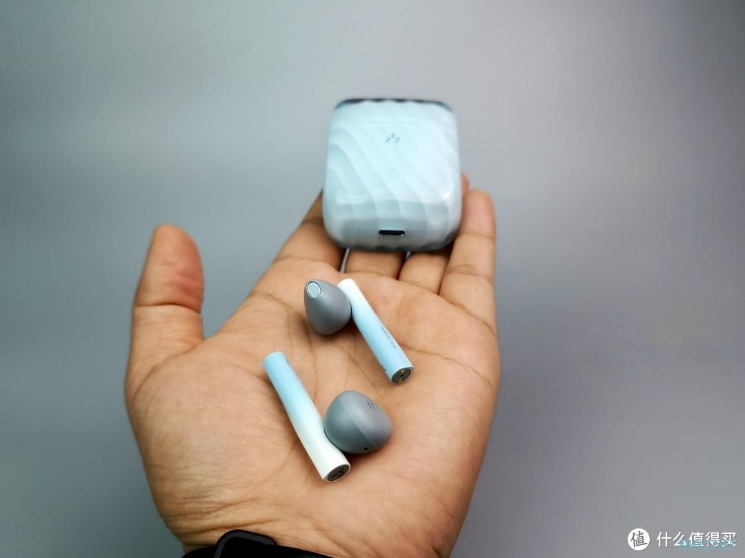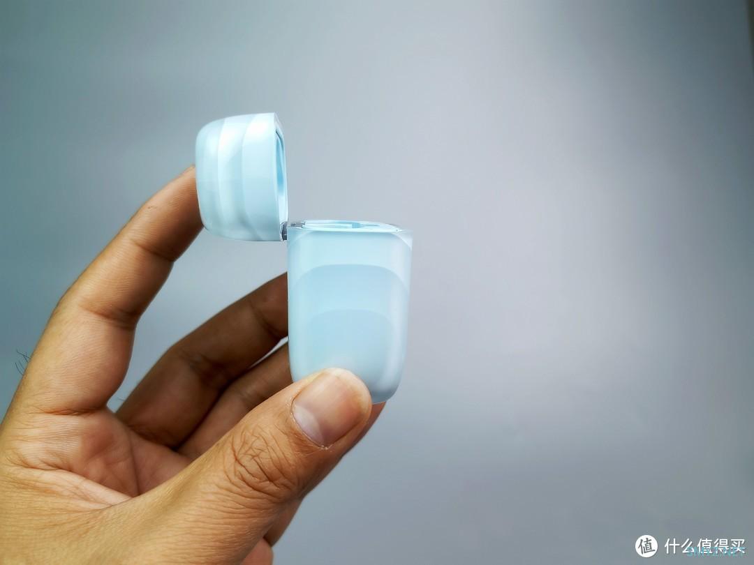 充电盒最外层是亚克力材质,和里面的材质一体注塑而成,浑然天成,有点石头上结了厚厚一层冰的既视感,冰蓝色很炫酷。