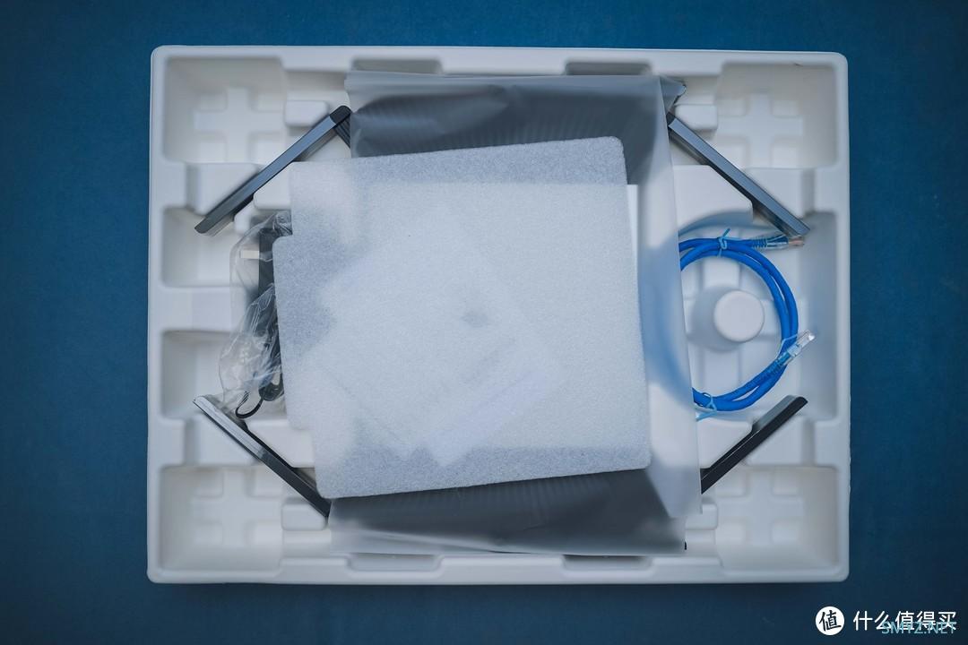 以前吐槽 TP-LINK 的包装盒里面的黄色硬纸壳太 LOW 了,一点花成本的感觉都没有,现在就换成质感更好的白色了,还是老传统的包装。为了避免银色机身被刮花,只给机身包了一层薄膜纸,可以看到 XDR5480 本体也是非常巨大的,天线基本都是平摊开来。