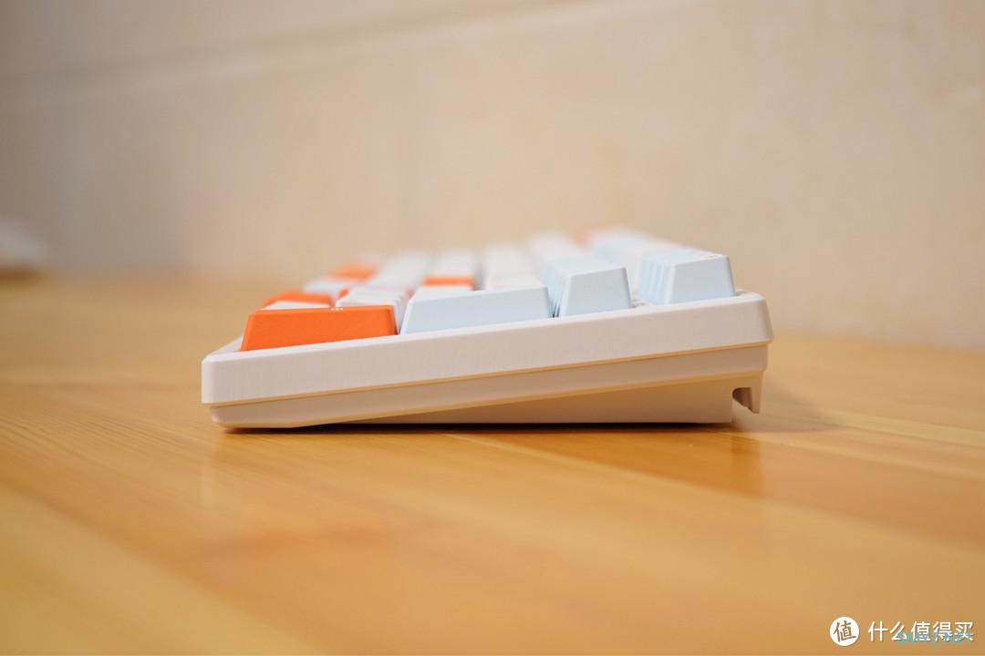 从键盘的整体设计看,HELLO GANSS HS98T是主流的98配列,并搭配窄边的木纹面外壳和橙+浅蓝+白的白羽配色,整体看起来十分清新。
