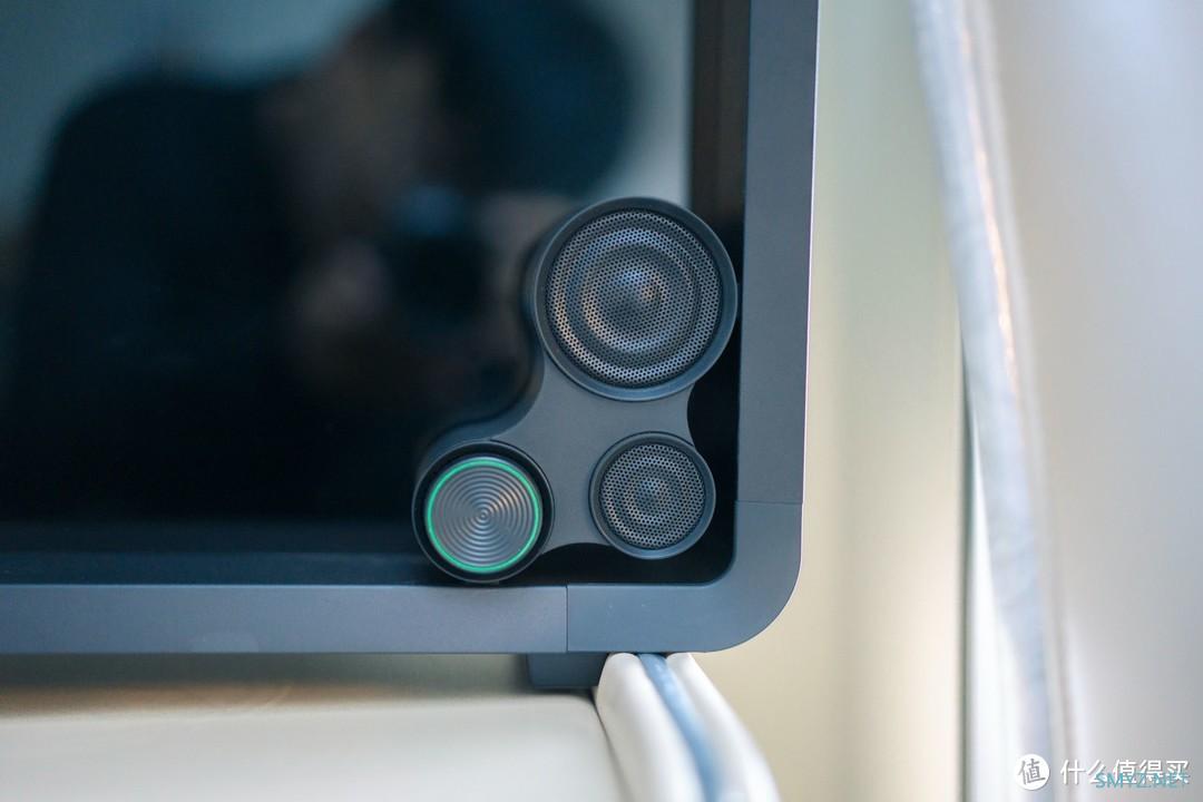 内置的蓝牙5.0芯片与高通旗舰级atpX HD音频解码技术相结合,提供了接近有线播放的低延迟音质,在保证音质的前提下,传输有效距离可达到30米,打破了我对于蓝牙连接范围的认知。同时除了蓝牙连接以外还支持wifi模式下体验无损音质。有了蓝牙与wifi的两种连接方式,智能方面自然是少不了,通过专属的app,可以远程控制音效、画面、屏幕背景亮度以及调节氛围灯的效果。说到氛围灯这里还是要说一下,在音箱的背面,看上去特别像一只眼睛,与旁边红色的低音炮形成鲜明的对比,同时又起到相互呼应的效果。