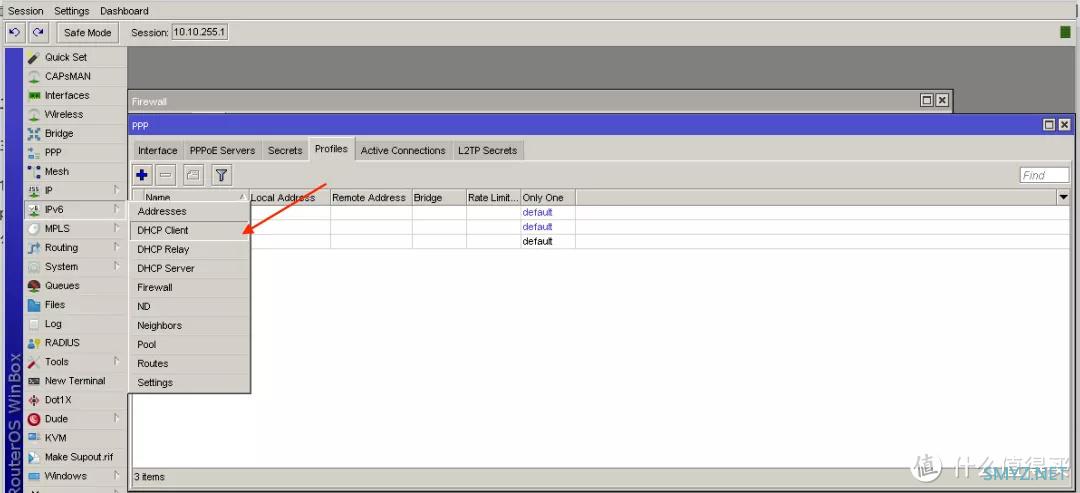 用winbox连接ROS,打开IPv6 --> DHCP Client。Interface选择PPPoE拨号连接(我这里是pppoe);Request勾上prefix;Pool Name随便填,如IPv6;Pool Prefix Length填入运营商分配的,我这里是64(一般是64,56,48这3种);勾上“Rapid Commit”;勾上“Add Default Route”;点击OK。获取成功后的状态为Status:bound。