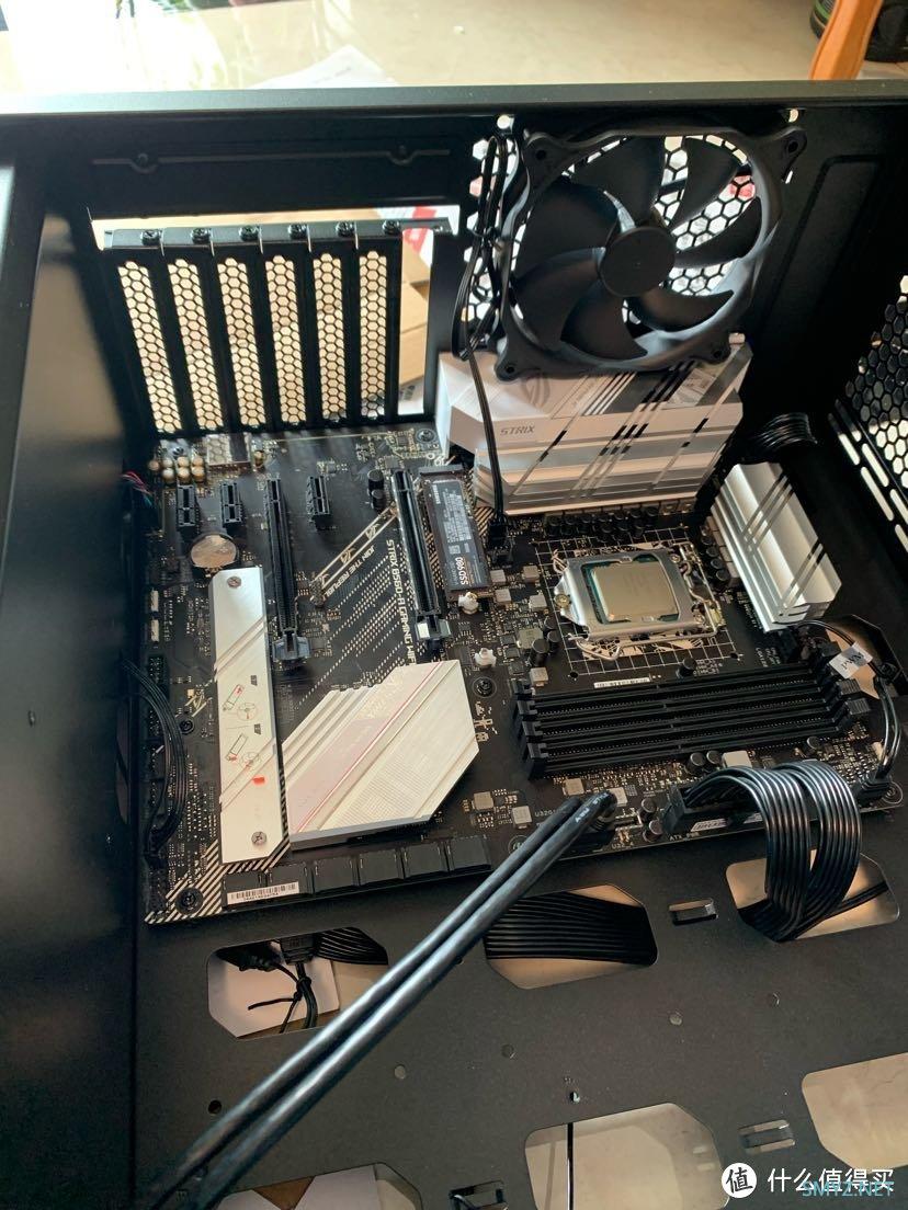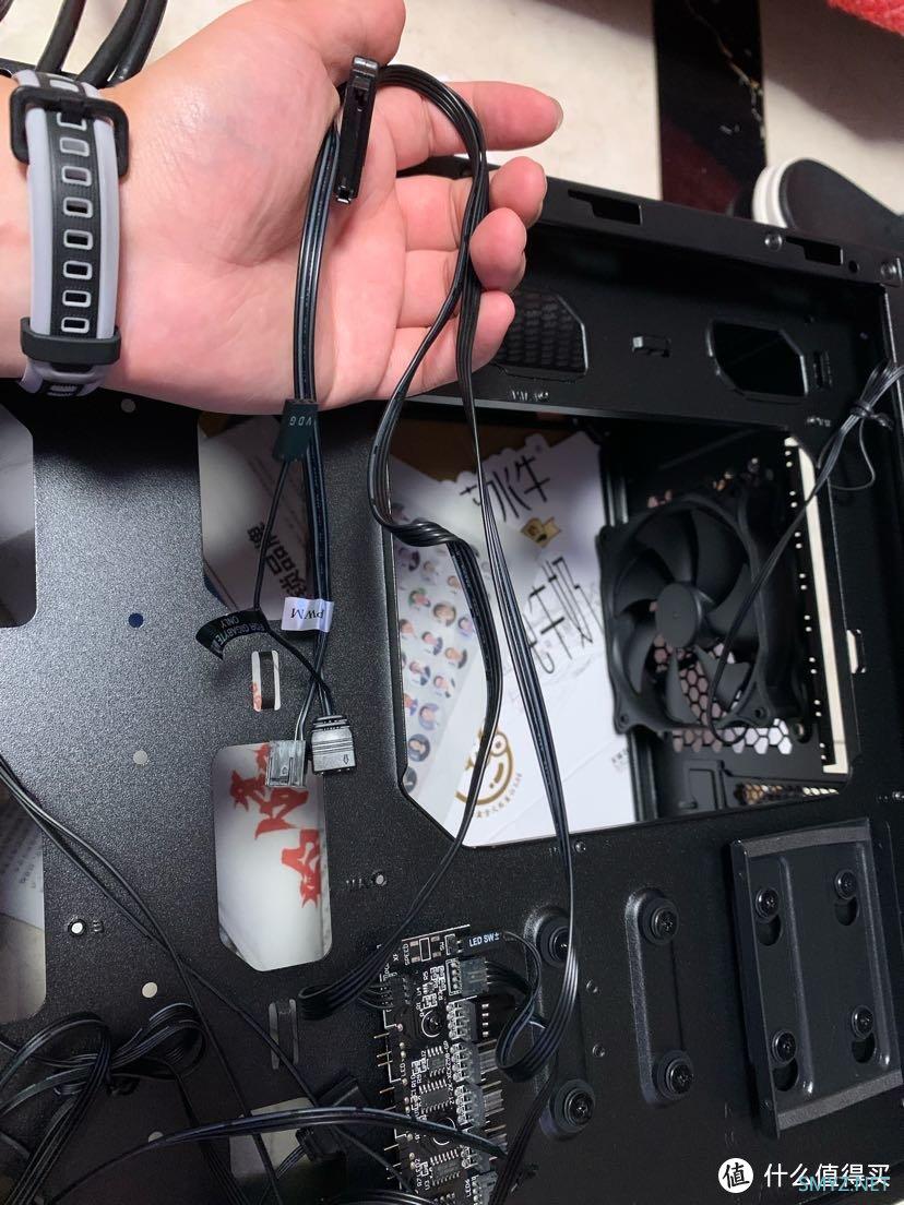 机箱自带的RGB灯条和风扇线路长短不是很合理,为了整理这一部分,怎么绕线可是废了一番脑子。等到接上主板电源线什么的,发现自己其实折腾了半天,计划了半天想用全模组实现的清爽走线,最终也是有点然而并没有什么效果了