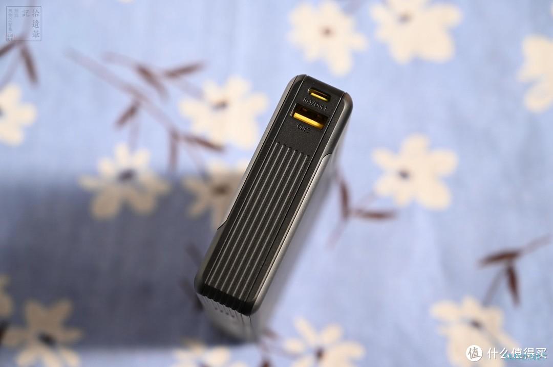 AOHi 100W充电宝把接口放在了一角,同时采用竖直接口的设计,在我实际用过之后,发现这种结构确实很好,接线的时候更加方便。另外不难发现,这两个接口的内舌也是黄色的,看起来很醒目,同时也显示了这款充电宝快充的特性。