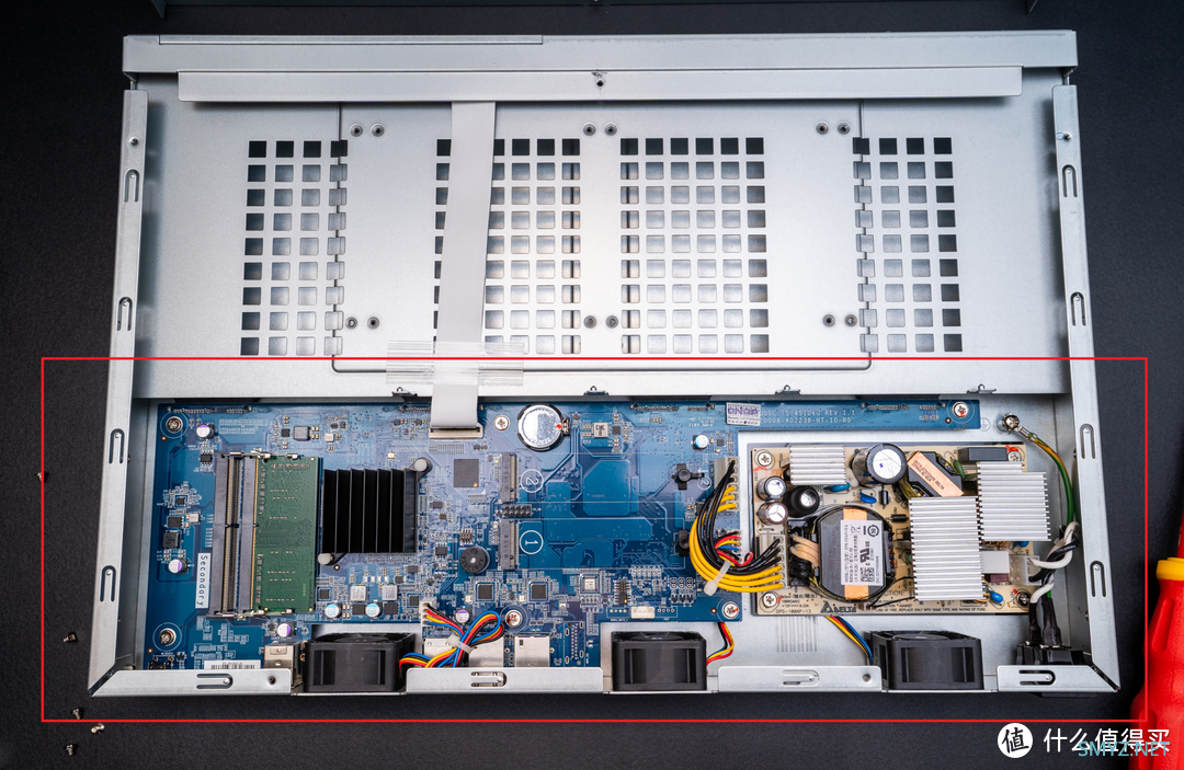 3、在主板右侧是内置的电源,这个电源免去了散热风扇,设计还是很巧妙的: