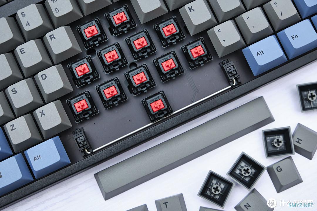 卫星轴固定的很稳,不会出现明显的晃动,除了空格以外的大键位左右两侧有硅胶条填充,可以有效降低共振和空腔音。这把键盘除了空格键的钢丝音有些明显外,其它大键位的调校都很不错,空格键可以稍微加一点润滑脂进行改善。总的来说,Cherry红轴(线性轴)搭配无钢设计,将无钢的优势发挥的很到位。