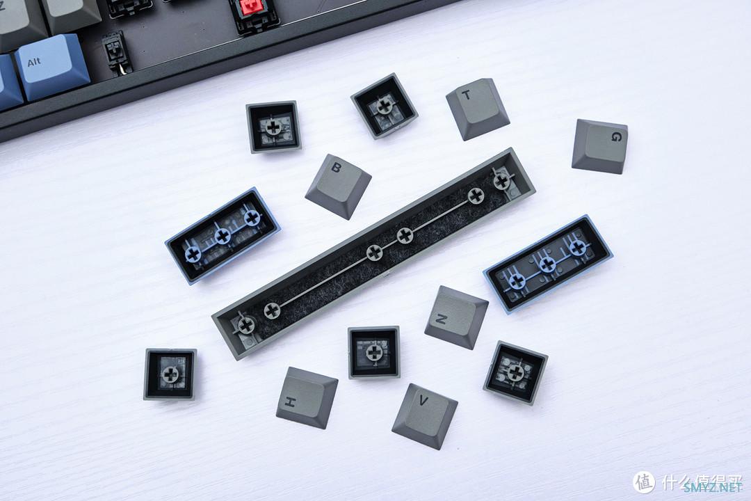 在空格键内部还使用毛毡布一类的材料做了填充,以起到吸收降低噪音的目的。
