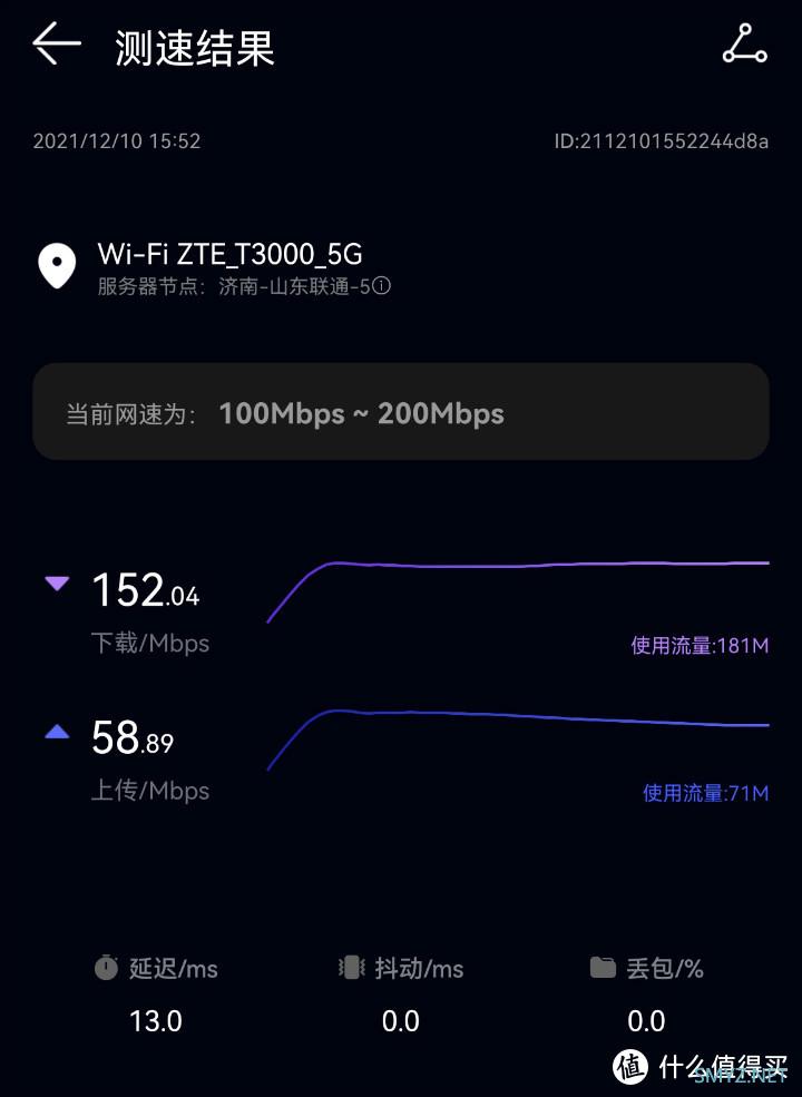 A点:距离无线路由器6米左右,中间隔一堵混凝土承重墙,Wi-fi信号强度2个格,手机App测速平均152Mbps,网速几乎没有波动,玩游戏看视频完全够用了。
