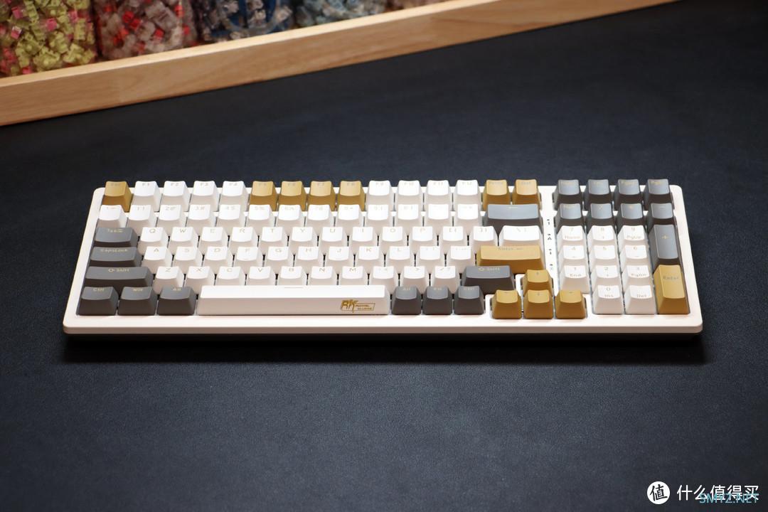 ▲微光配色键帽是由白、黄、灰三色组成,键位布局和传统的98键很像 不过RK98取消了F区键位之间的间隔 增加了两颗按键,使得键盘整体共计100个键位