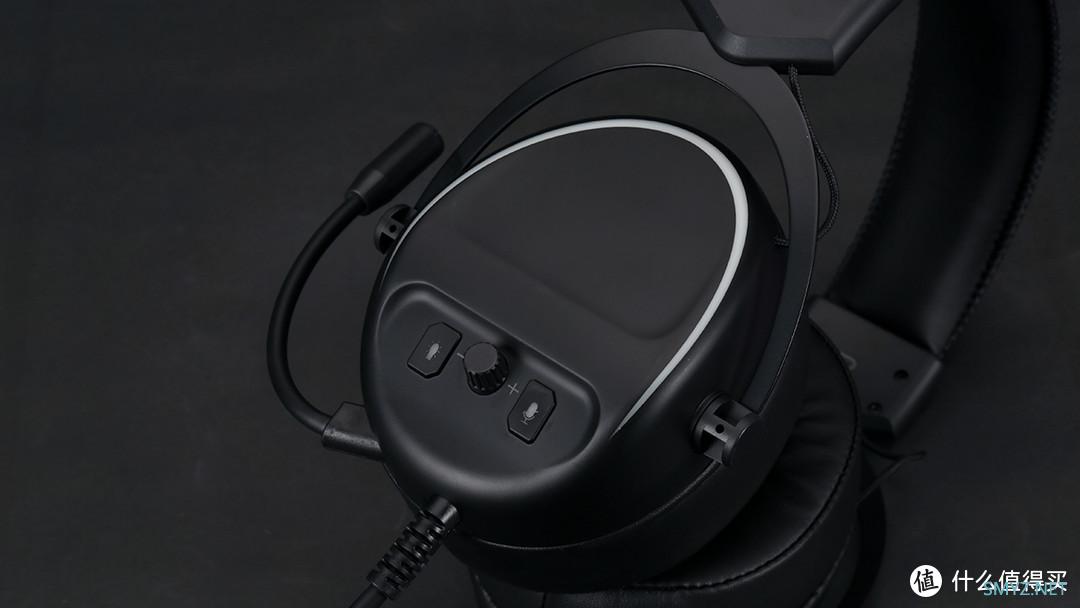 耳罩外壳采用了椭圆形设计,表层为类肤材质,有着极佳的手感表现,偏中下位置上加入横置装饰条,用于区分耳罩外壳上下区域,微凸的设计也营造了更多的视觉层次感,耳罩外壳上边缘位置加入的半环绕RGB灯带,也可以为耳机提供出色的灯光效果表现。在左侧外壳上,还加入了快捷控制面板,提供了灯光开关、麦克风开关和音量调节,方便用户快速调整,易用性还是很高的。音量调节采用小型旋钮设计,阻尼感适中,并加入限位方案,质感表现还是不错的,不过音量旋钮在旋转时没有刻度感,细致调节上还是稍稍逊色一点。