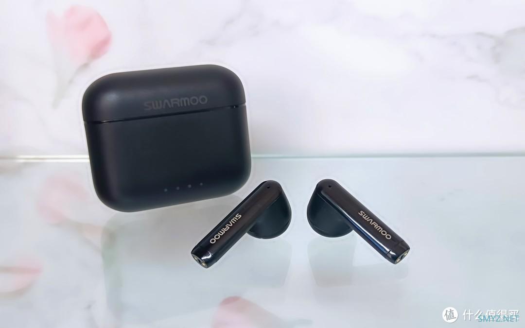 充电盒虽然也是黑色外观,但却是哑光磨砂涂层,圆转角造型,光滑圆润,触感细腻。盒盖上印有SWARMOO标识,中间是高亮的盒体分界线。