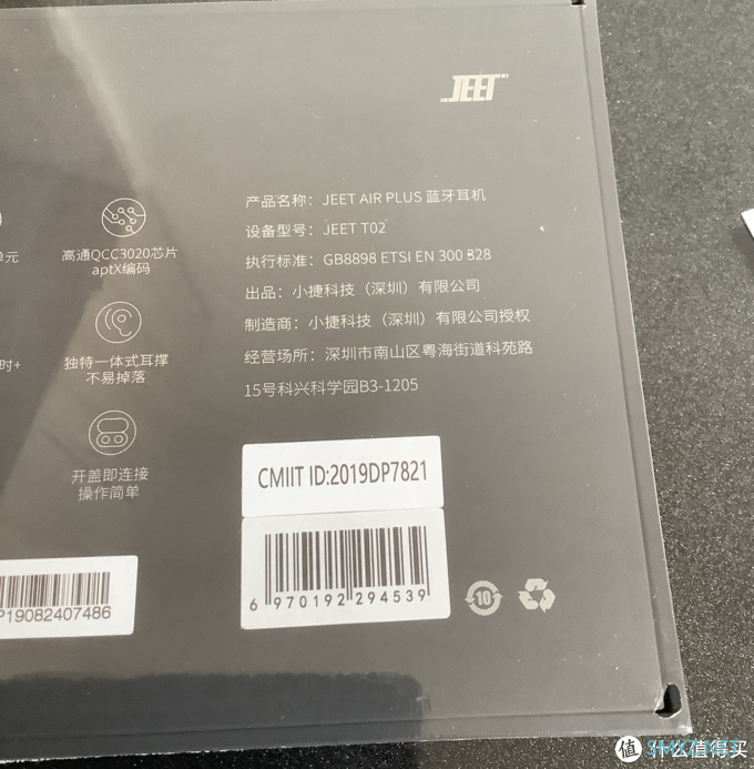 总体设计上来说有点像礼品,让人感觉有些高端。外表偏哑光,手感较好,完全没有两三百的感觉,甚至就个人觉得,论包装,JEET远胜小米。可能也不会输给Airpods。